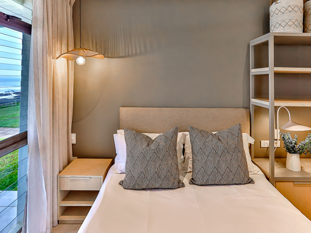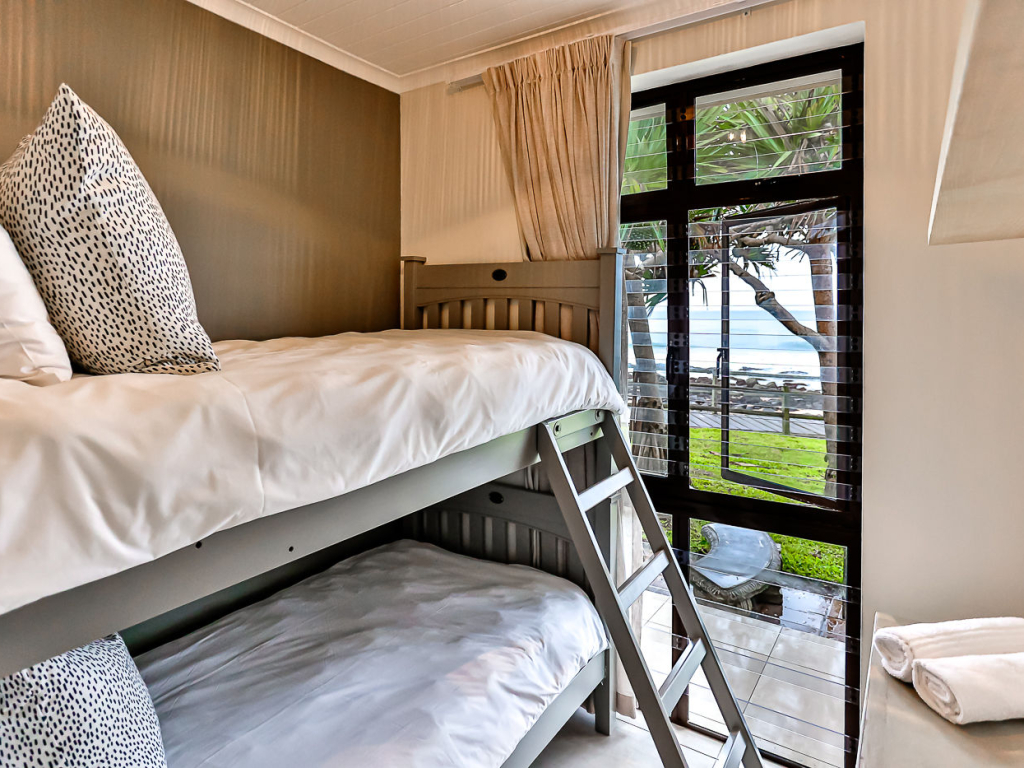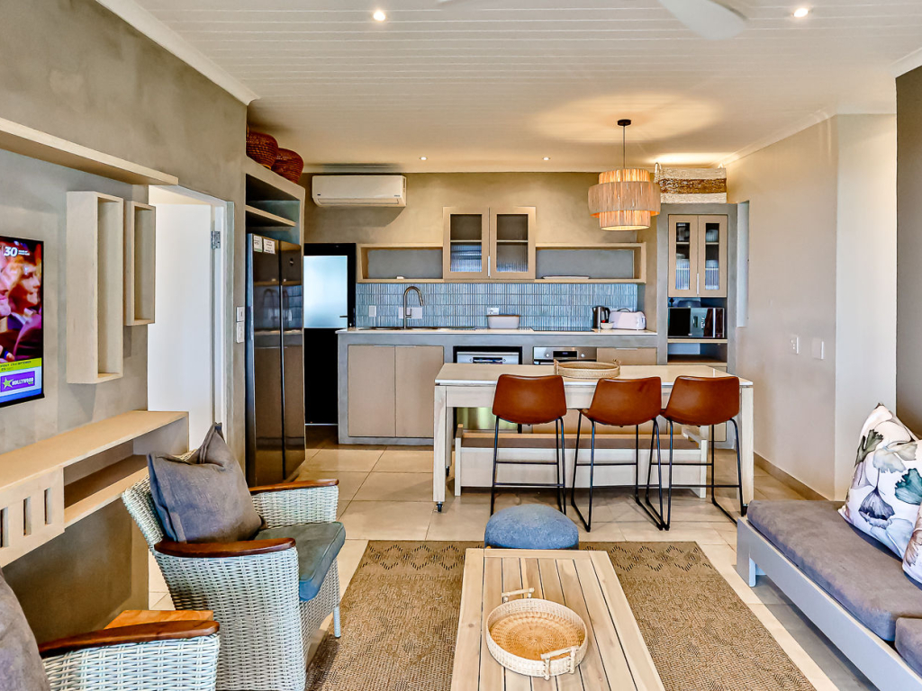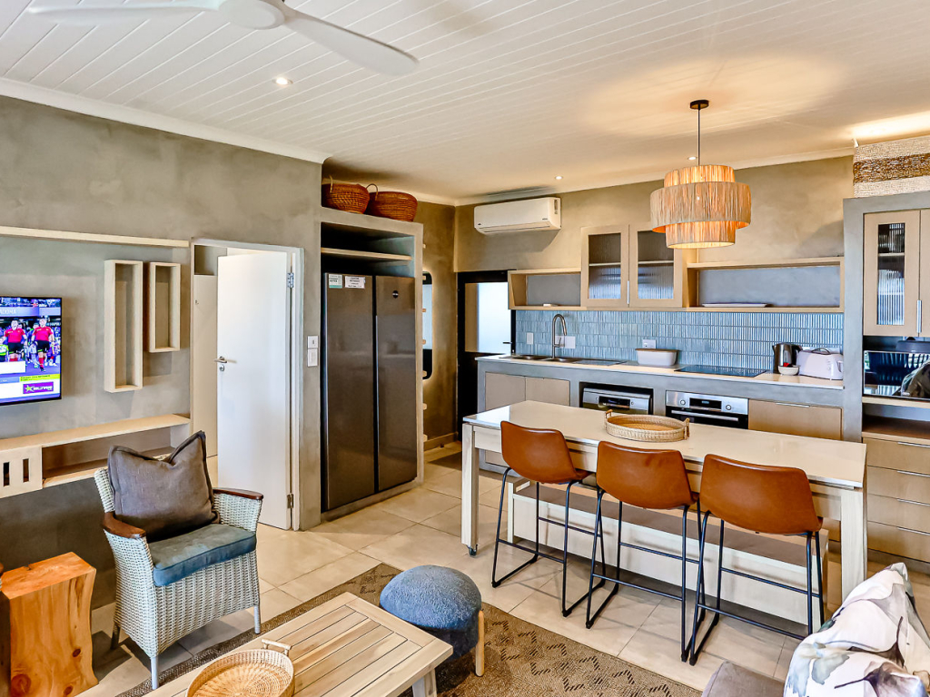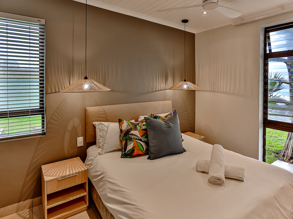 Both the main and second bedroom has queen size beds, and the third bedroom has a bunk bed, comfortably sleeping 4 adults and 2 kids. There are 2 bathrooms, both with showers (no bath). There are ceiling fans in all bedrooms and top-quality finishes throughout the unit. There is air-conditioning in the kitchen/lounge area.