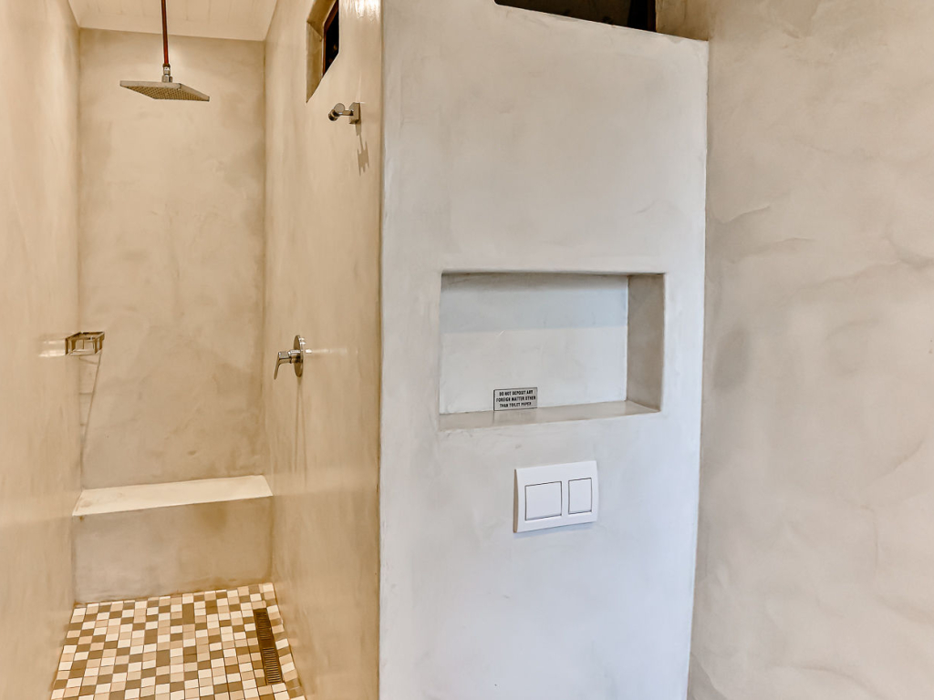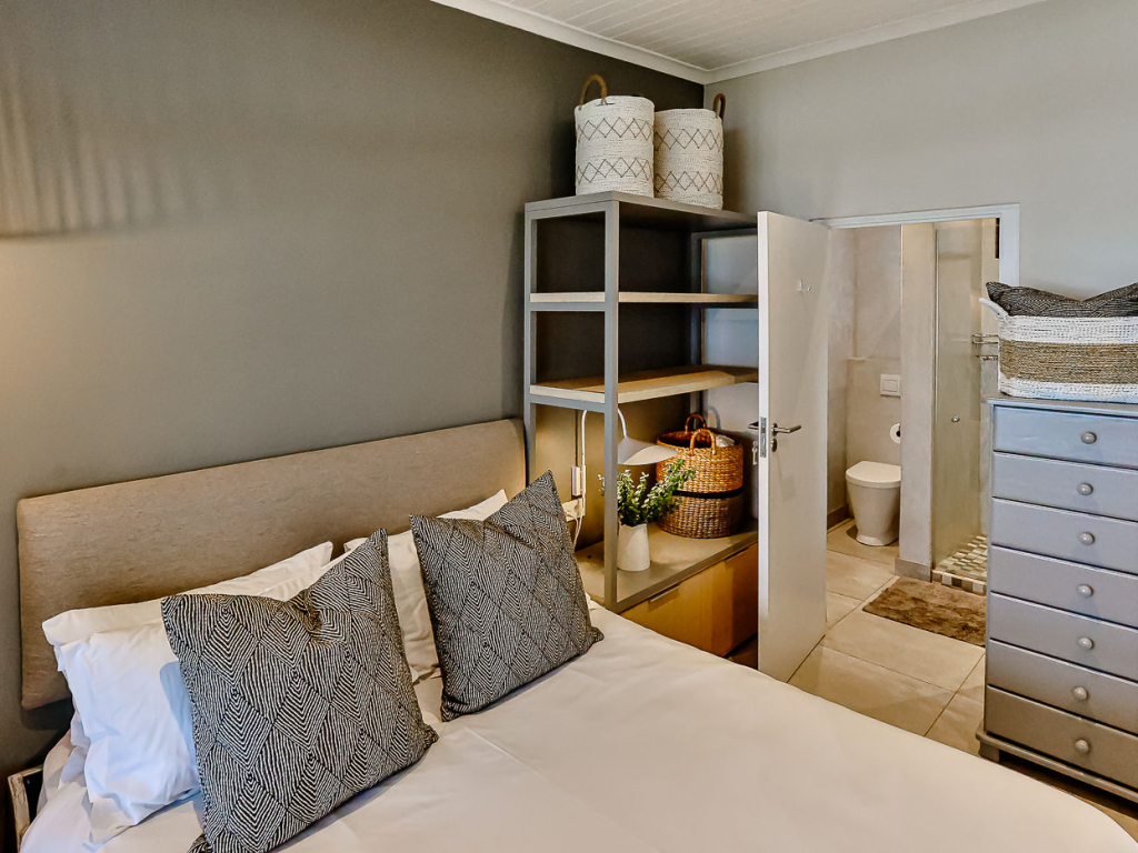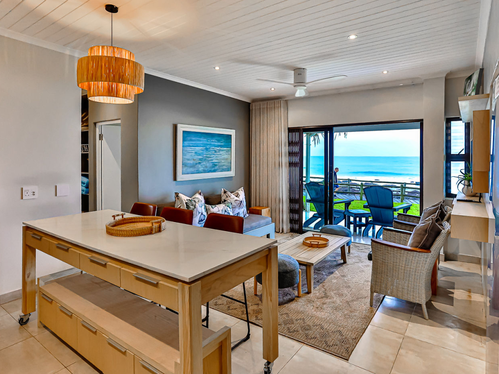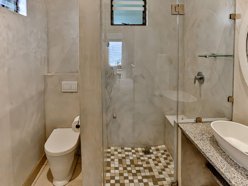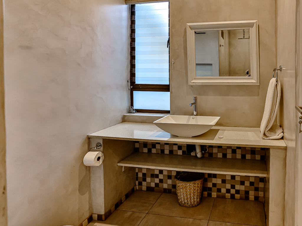 Both the main and second bedroom has queen size beds, and the third bedroom has a bunk bed, comfortably sleeping 4 adults and 2 kids. There are 2 bathrooms, both with showers (no bath). There are ceiling fans in all bedrooms and top-quality finishes throughout the unit. There is air-conditioning in the kitchen/lounge area.