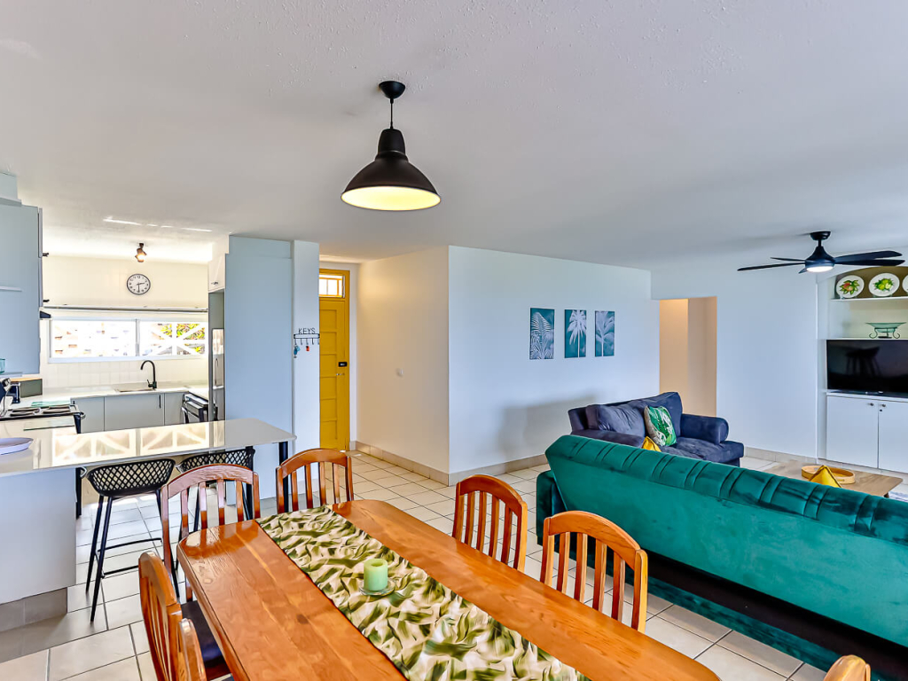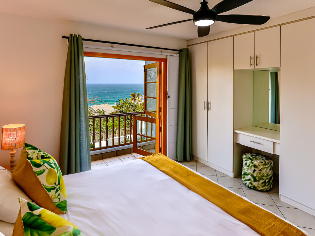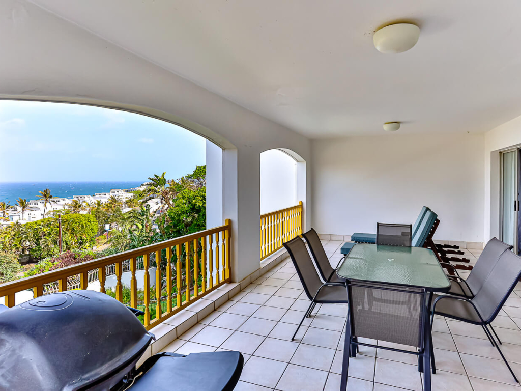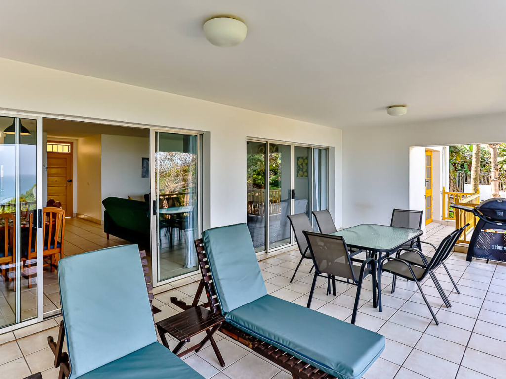 The apartment features a stylish open-plan living area with a smart TV and uncapped Wi-Fi. Sliding doors open onto a furnished patio with a Weber braai, where you can relax, enjoy quality family time, and take in spectacular sea views.