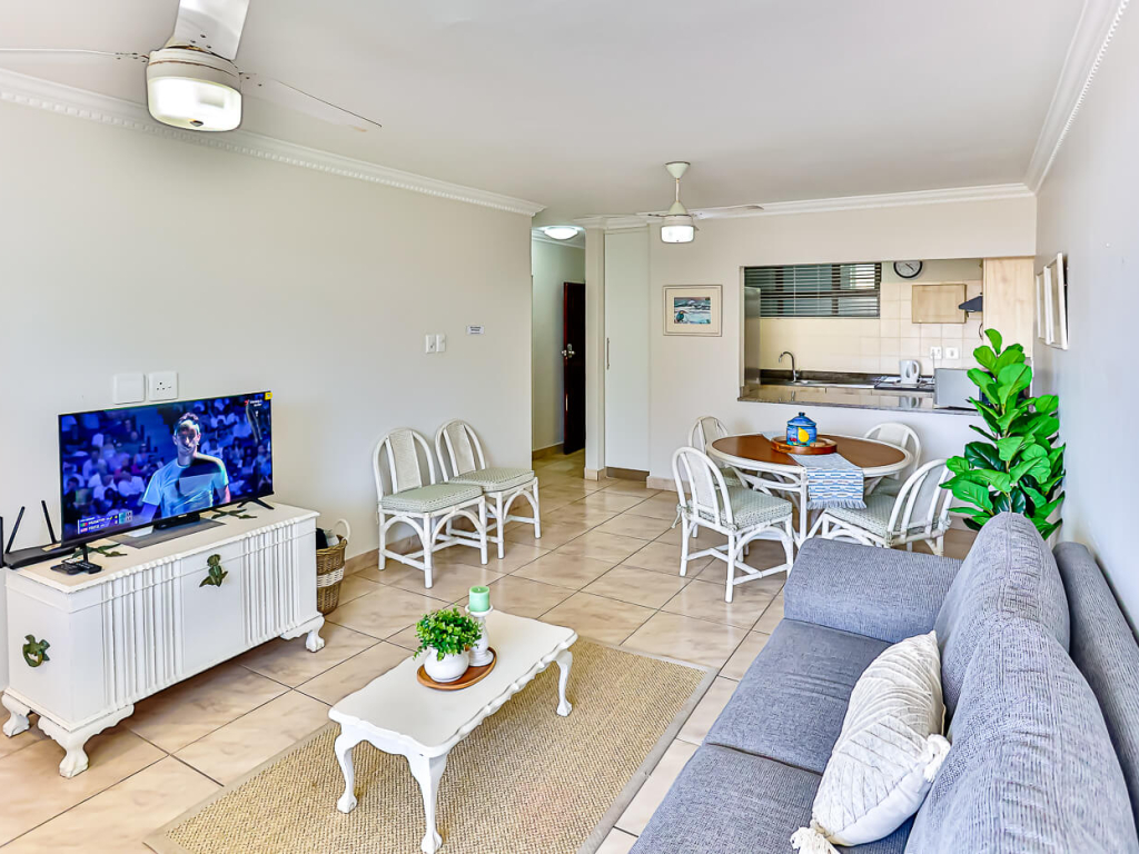 The spacious dining room/lounge area with un-capped WiFi and TV with HP DSTV, opens up onto the large furnished balcony where you will be able to enjoy the afternoon sunset.