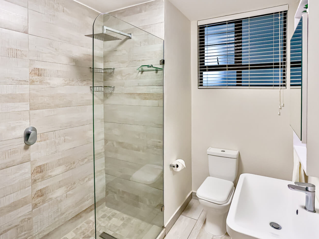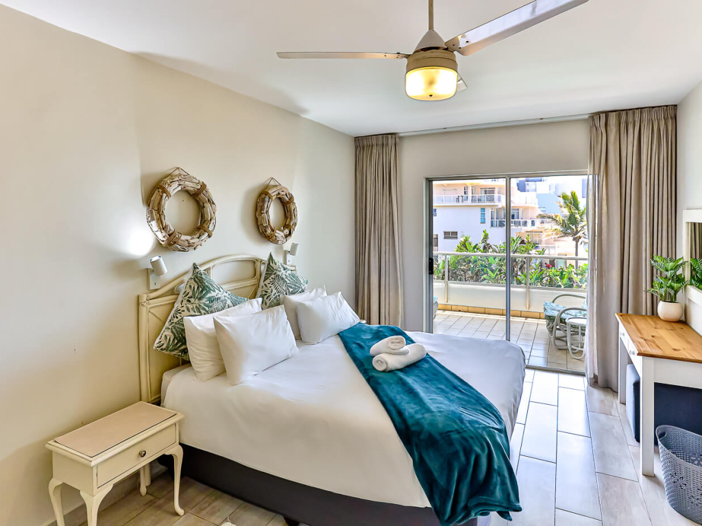 The main bedroom with queen sized bed opens onto a balcony with spectacular breaker sea views. The en-suite bathroom with a lovely large shower, leads into the bedroom, with access into the living area as well.