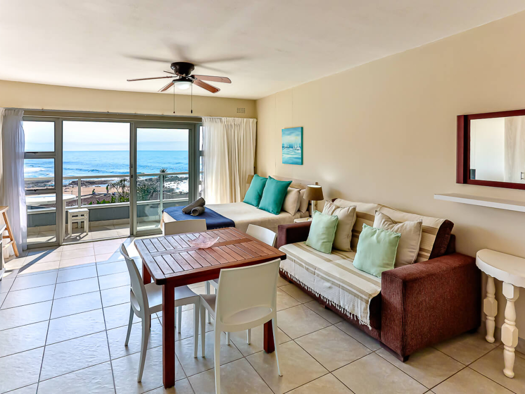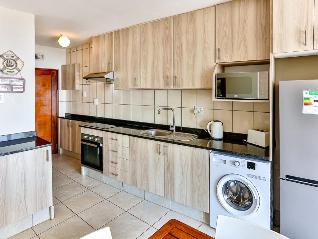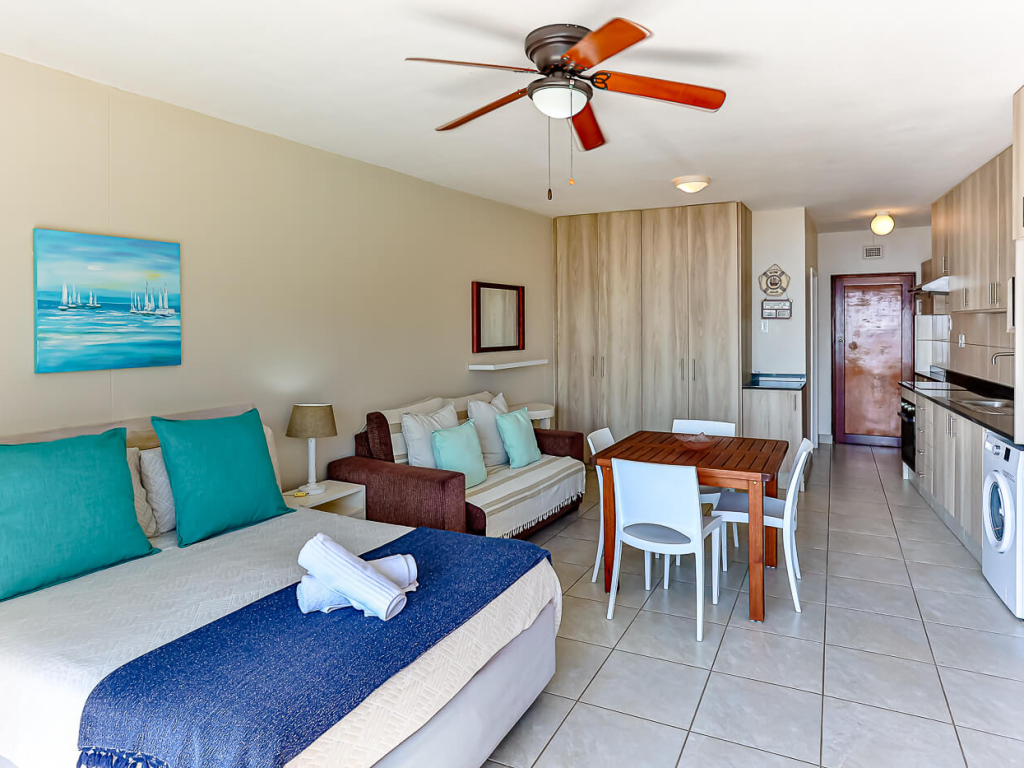 The apartment is comfortably furnished and equipped with stove, fridge/freezer, microwave, toaster, kettle, and all the necessary cutlery and crockery to serve 2 people. The open-plan unit has a double bed, couch and 4-seater table and leads through sliding doors onto a private, covered balcony. There is a safe in the cupboard and the unit has Wi-Fi with a Smart TV where you can stream DSTV Now and Netflix with your own log in details. The bathroom consists of a basin, toilet and a shower.