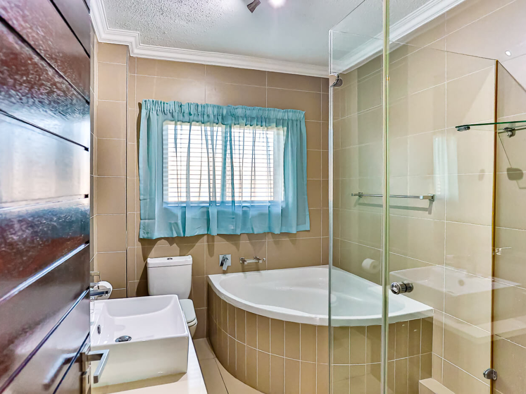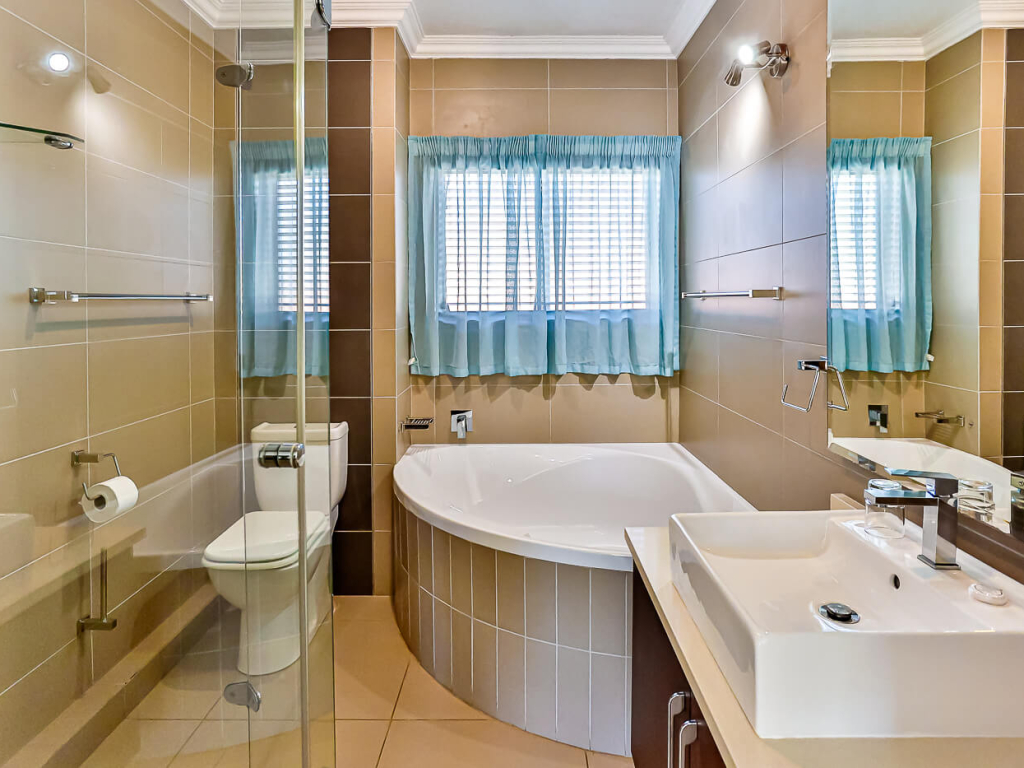 The braai area is situated at the swimming pool in beautifully kept tropical gardens and thatched roof sun covers. There is secure undercover parking for one vehicle. The gate is accessible by remote control only. There are ceiling fans right through the apartment.