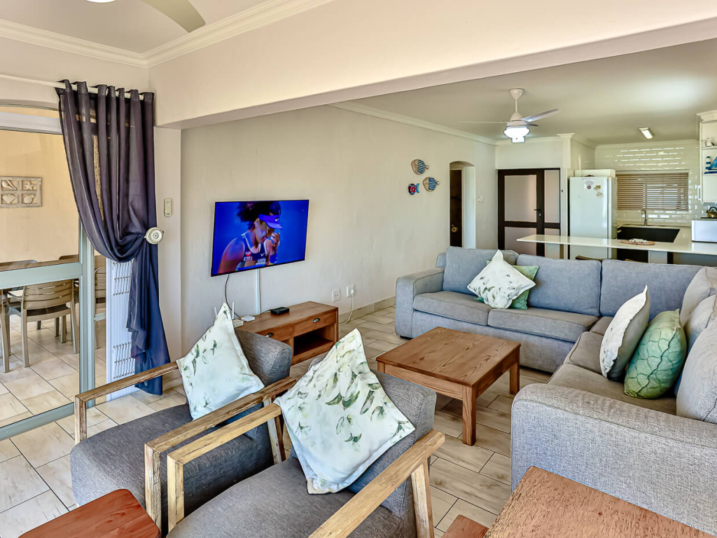 This neat child friendly apartment is situated on the ground floor in a very popular complex on the Ballito beachfront. With immaculate lawns and a fenced in pool it will give parents the chance to relax on the veranda while the kids play in a safe environment. Clark Bay swimming beach is directly in front of the complex and is protected by shark nets and lifeguards, and a tidal pool close by.
